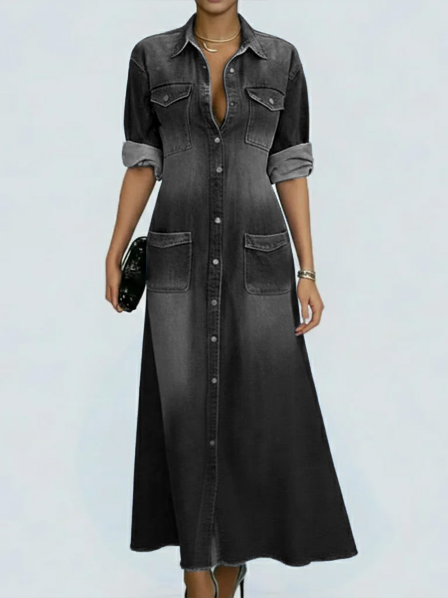 Women's Lapel Long-sleeved Casual Loose Denim Shirt Dress