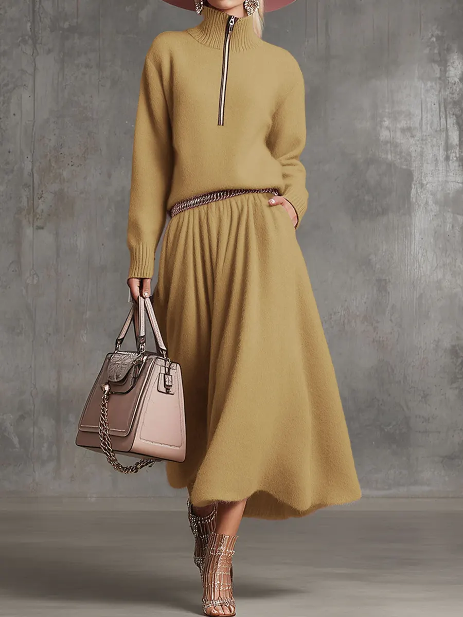 Women's Solid Color High-Neck Long-Sleeve Casual Loose Knit Top and High-Waisted Solid Color A-Line Knit Skirt Set