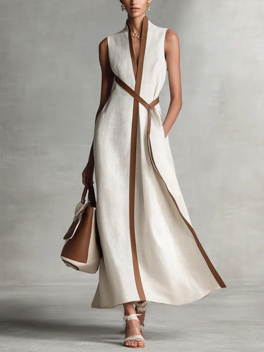 Defined by elegance, crafted for comfort. This sleeveless maxi dress features a striking contrast trim that accentuates its fluid, wrap-style silhouette. It is the ultimate summer statement piece for women who appreciate modern minimalism with an artistic twist.